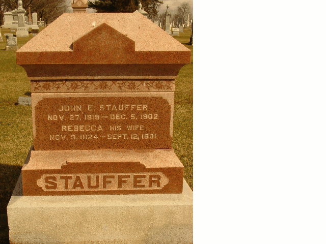 John E. Stauffer, son of Christian Stauffer, was born November 27, 1819 in Jonestown, Lebanon County, Pennsylvania. He was named after his mother Christiana Ensminger. In 1833 he moved with his family, by wagon, to Stark County Ohio. On August 14, 1842 he married Sarah Rebecca Haight. Sometime afterwards they moved to Indiana. The Federal Census of 1860 shows John and Rebecca living in Baugo Township, Elkhart Indiana with 8 of their 12 children. Shortly after the Civil War the family moved again, this time to Pine Creek Township, Ogle County Illinois. John purchased 80 acres off the Lowell Park road. He farmed the land until he retired in 1880, and moved to Polo Illinois. He rented his farm to his son Daniel who later purchased the land upon his father’s death. The Federal Census of 1900 shows John and Rebecca living in Buffalo Township, Ogle County Illinois in the town of Polo. He was 80 years old and Rebecca was 75. Their youngest daughter Annie, 25 lived with them. John and Rebecca lived in Polo, Illinois until their death. They are both buried in the Fairmount cemetery in Polo north of town on IL Route 26.